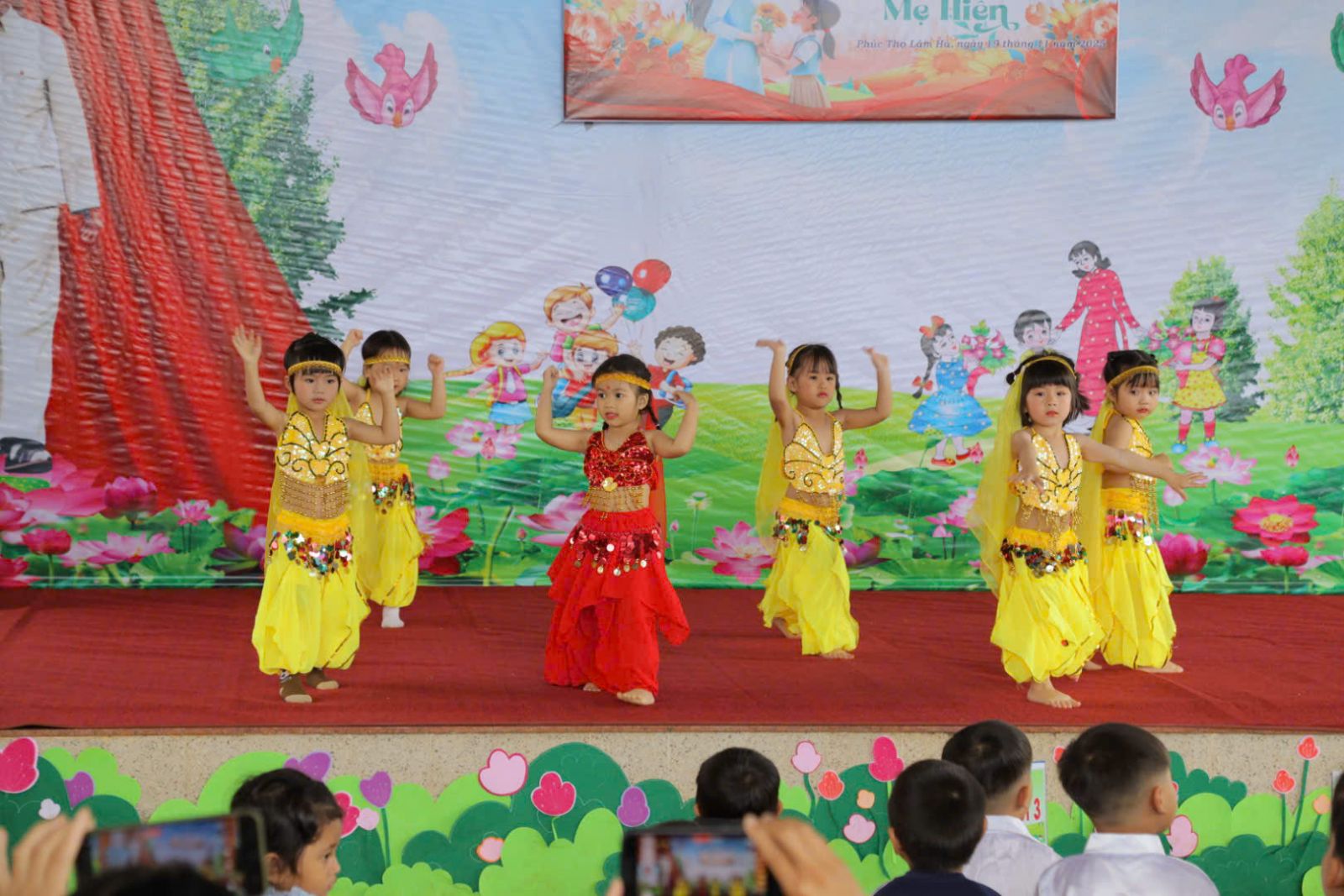 Tiết mục múa Latin “Indian Bollywood Dance” do các bé lớp Mầm biểu diễn mang đến sắc màu rực rỡ và tràn đầy năng lượng. Với những động tác đáng yêu, tự tin cùng trang phục bắt mắt, các bé đã tái hiện không khí vui tươi, sôi động đặc trưng của Bollywood. Màn biểu diễn hứa hẹn sẽ đem lại cho quý vị những khoảnh khắc thật vui vẻ và ấn tượng, đồng thời thể hiện sự mạnh dạn, hồn nhiên và khả năng cảm thụ âm nhạc tuyệt vời của các bé.