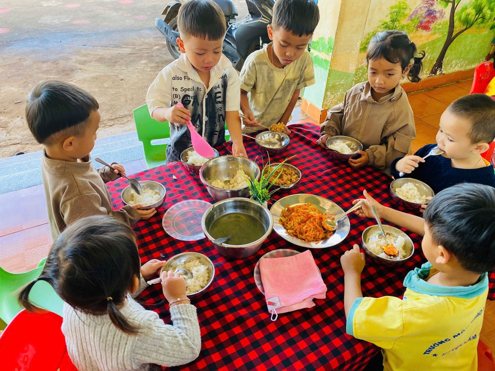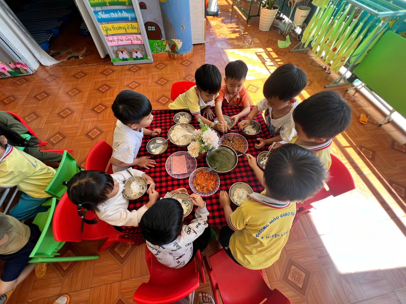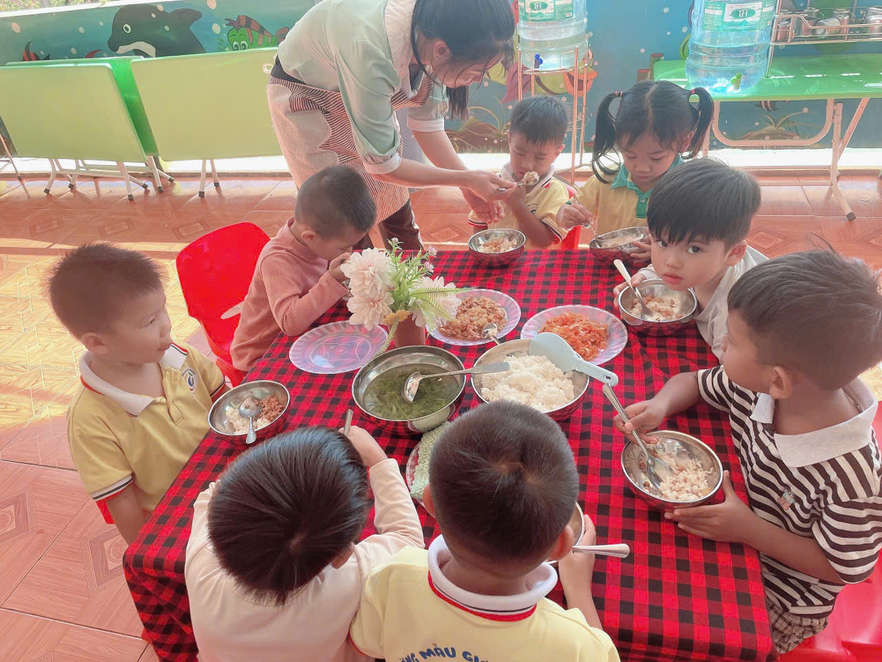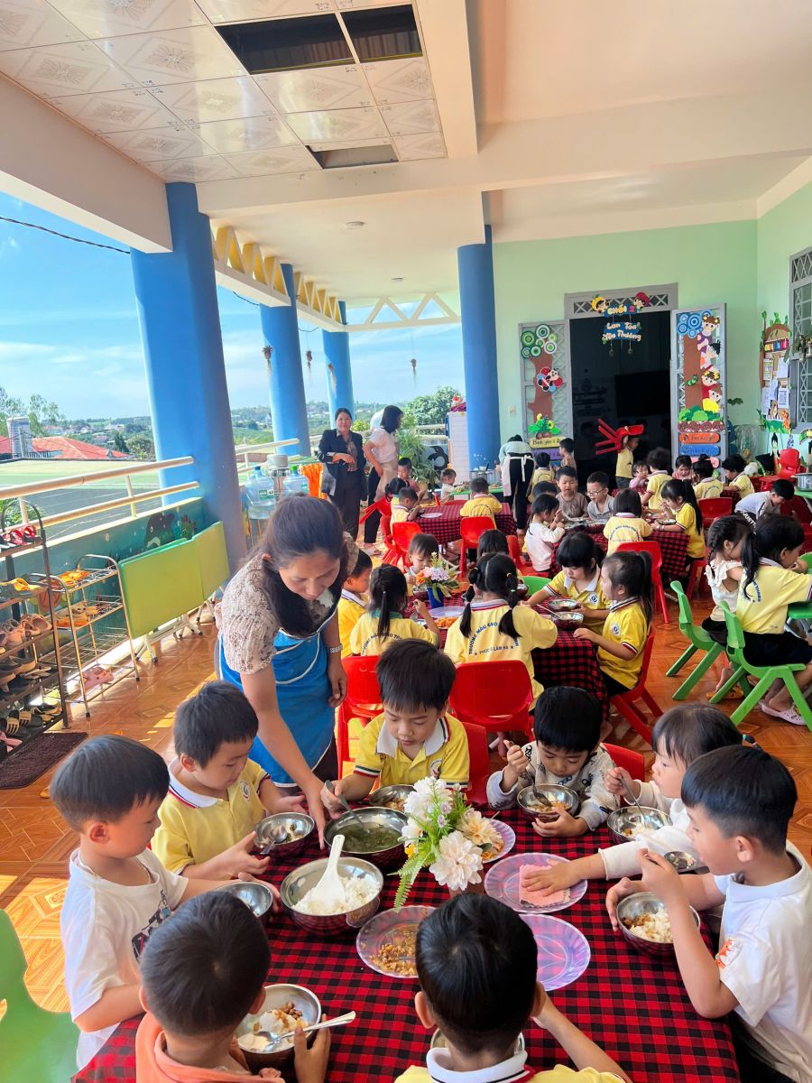 Trong quá trình tổ chức bữa ăn gia đình, giáo viên luôn đóng vai trò là người hướng dẫn, đồng hành và quan sát trẻ. Trẻ được hướng dẫn rửa tay sạch sẽ trước khi ăn, xếp hàng ngay ngắn, tự chọn chỗ ngồi theo sự sắp xếp của cô giáo. Trước khi ăn, trẻ được rèn luyện thói quen lễ phép như mời cô, mời bạn; trong khi ăn, trẻ được khuyến khích tự xúc ăn, ăn từ tốn, gọn gàng, không làm rơi vãi thức ăn. Giáo viên nhẹ nhàng nhắc nhở, động viên kịp thời, tạo không khí vui vẻ, thoải mái để trẻ cảm thấy hứng thú, không áp lực khi tham gia bữa ăn. Đối với những trẻ còn ăn chậm hoặc chưa quen với việc tự phục vụ, giáo viên ân cần hỗ trợ, giúp trẻ dần hình thành tính tự lập và sự tự tin trong sinh hoạt hằng ngày.
