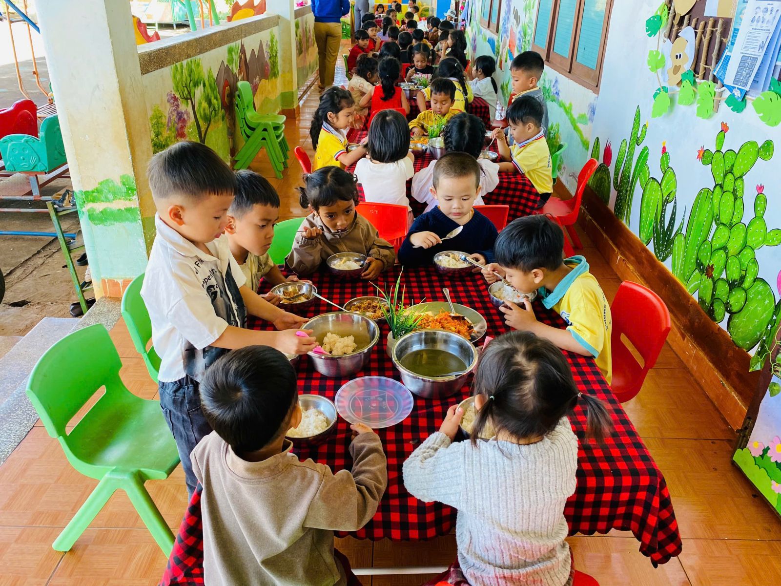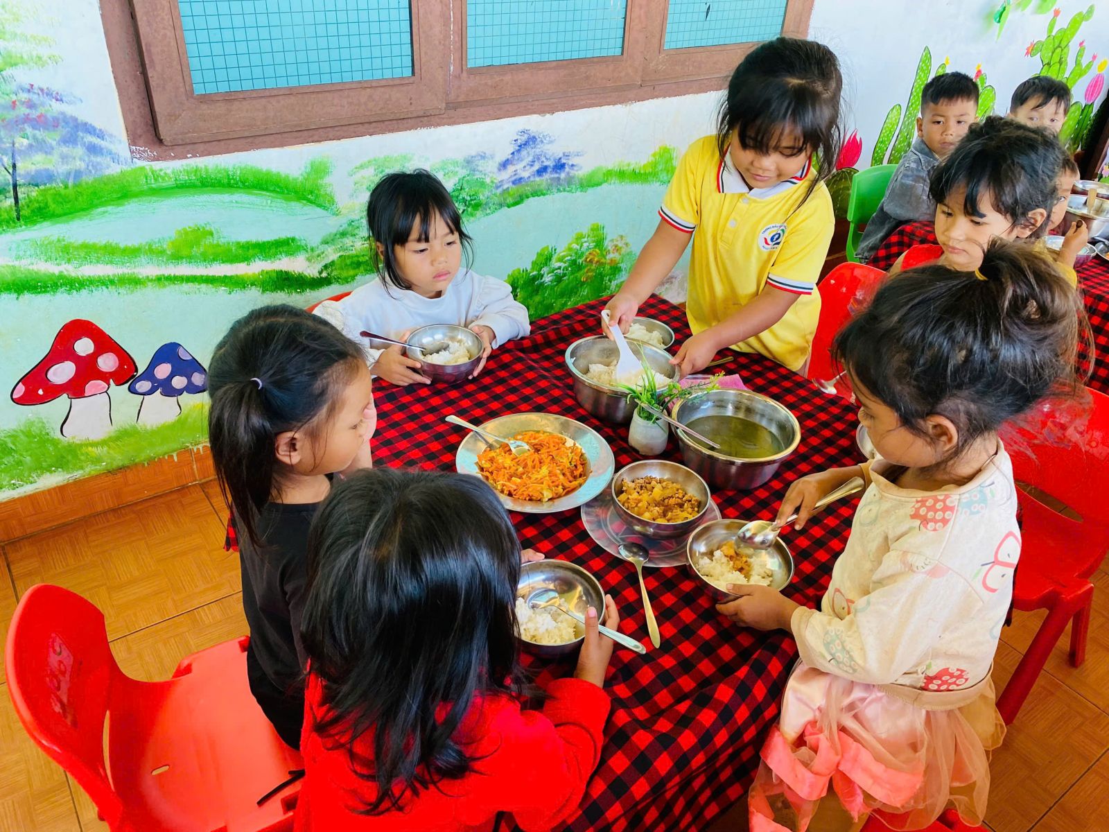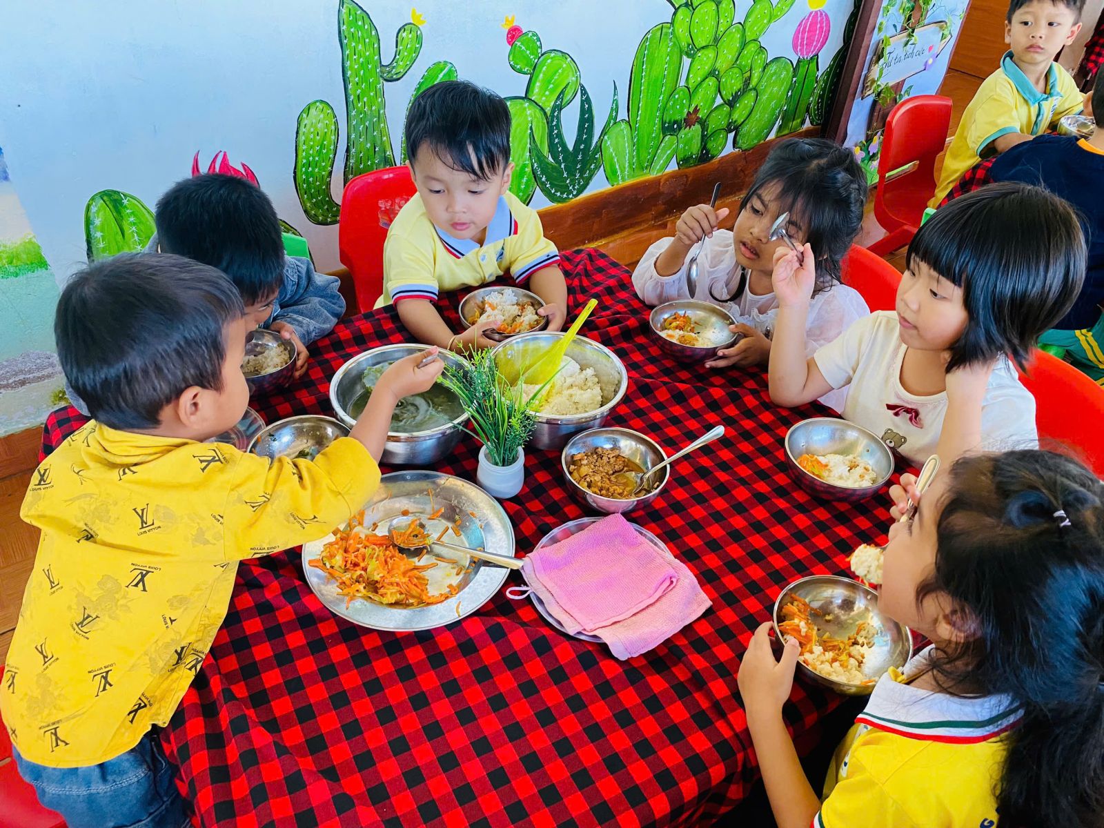 Trong quá trình tổ chức bữa ăn gia đình, giáo viên luôn đóng vai trò là người hướng dẫn, đồng hành và quan sát trẻ. Trẻ được hướng dẫn rửa tay sạch sẽ trước khi ăn, xếp hàng ngay ngắn, tự chọn chỗ ngồi theo sự sắp xếp của cô giáo. Trước khi ăn, trẻ được rèn luyện thói quen lễ phép như mời cô, mời bạn; trong khi ăn, trẻ được khuyến khích tự xúc ăn, ăn từ tốn, gọn gàng, không làm rơi vãi thức ăn. Giáo viên nhẹ nhàng nhắc nhở, động viên kịp thời, tạo không khí vui vẻ, thoải mái để trẻ cảm thấy hứng thú, không áp lực khi tham gia bữa ăn. Đối với những trẻ còn ăn chậm hoặc chưa quen với việc tự phục vụ, giáo viên ân cần hỗ trợ, giúp trẻ dần hình thành tính tự lập và sự tự tin trong sinh hoạt hằng ngày.