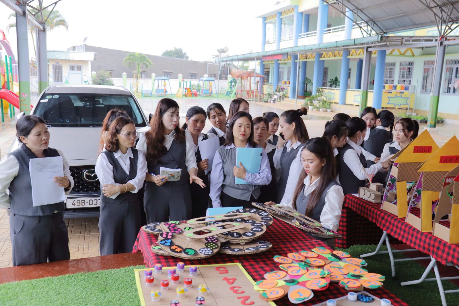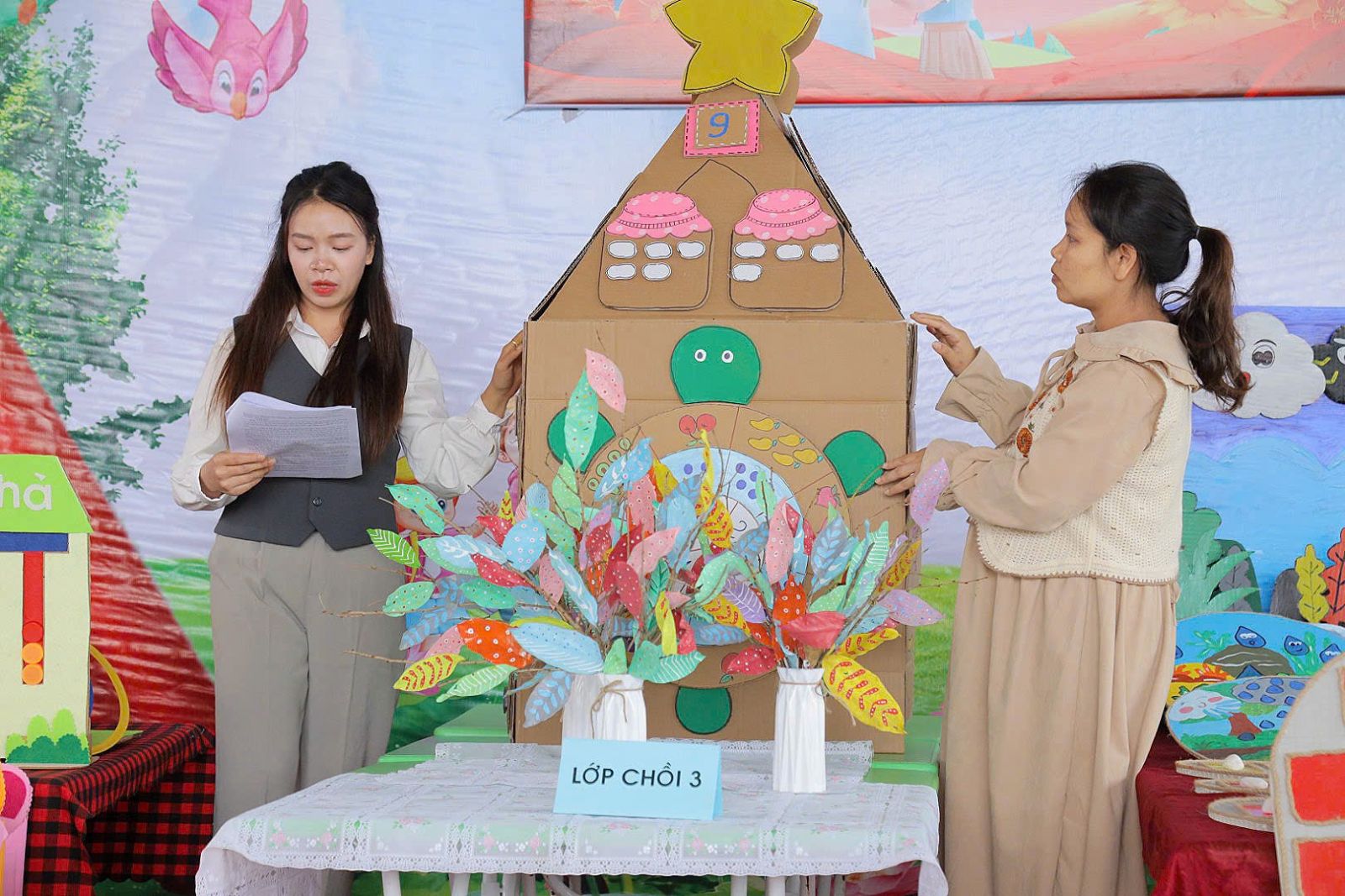 Để có được các bộ đồ dùng – đồ chơi hoàn chỉnh và chất lượng, nhiều giáo viên đã dành hàng giờ sau buổi dạy để mày mò, cắt dán, phối màu, thử nghiệm các chi tiết sao cho an toàn – thẩm mỹ – bền – phù hợp với trẻ. Việc tận dụng những vật liệu quen thuộc như chai nhựa, vỏ hộp, xốp, lá cây khô, gỗ, giấy bìa cattong… không chỉ giúp tiết kiệm mà còn mang ý nghĩa giáo dục về bảo vệ môi trường, giảm thiểu rác thải trong trường học.